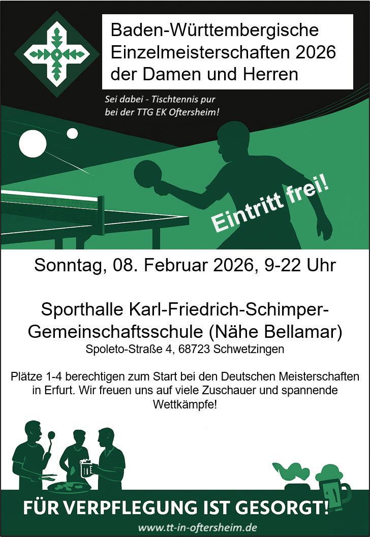 regelmäßig Ligaspiele statt. Darüber hinaus nehmen die Oftersheimer Tischtennisspieler erfolgreich an überregionalen Turnieren und Meisterschaften teil.