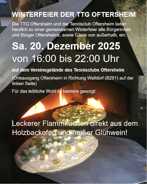 Um in entspannter Atmosphäre die Weihnachtszeit einzuläuten, lädt die TTG Oftersheim zusammen mit dem Tennisclub Oftersheim zu einer gemeinsamen Winterfeier ein.